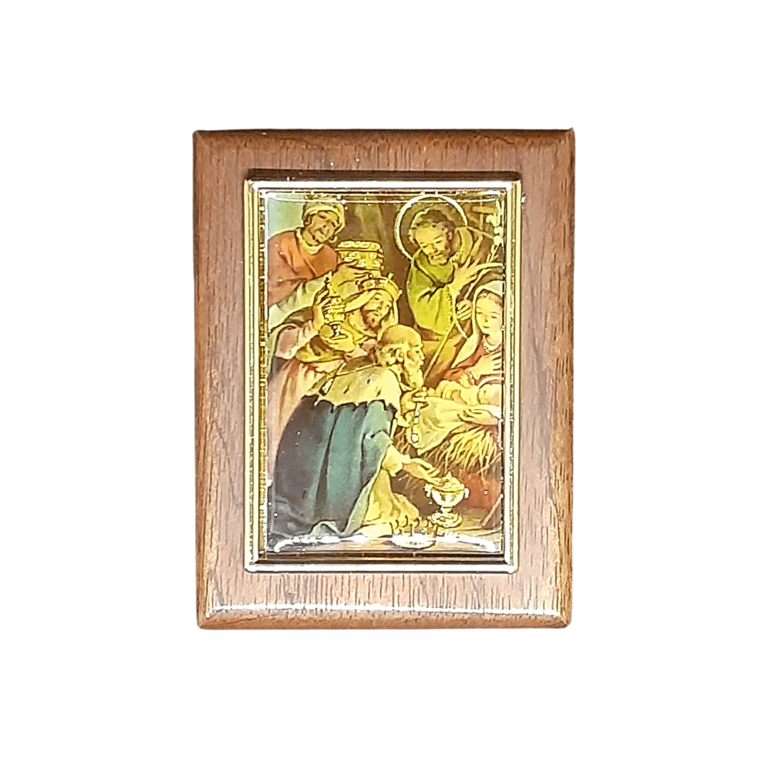 - wooden picture with some detail depicting Mary, Jesus, Joseph, and the three kings