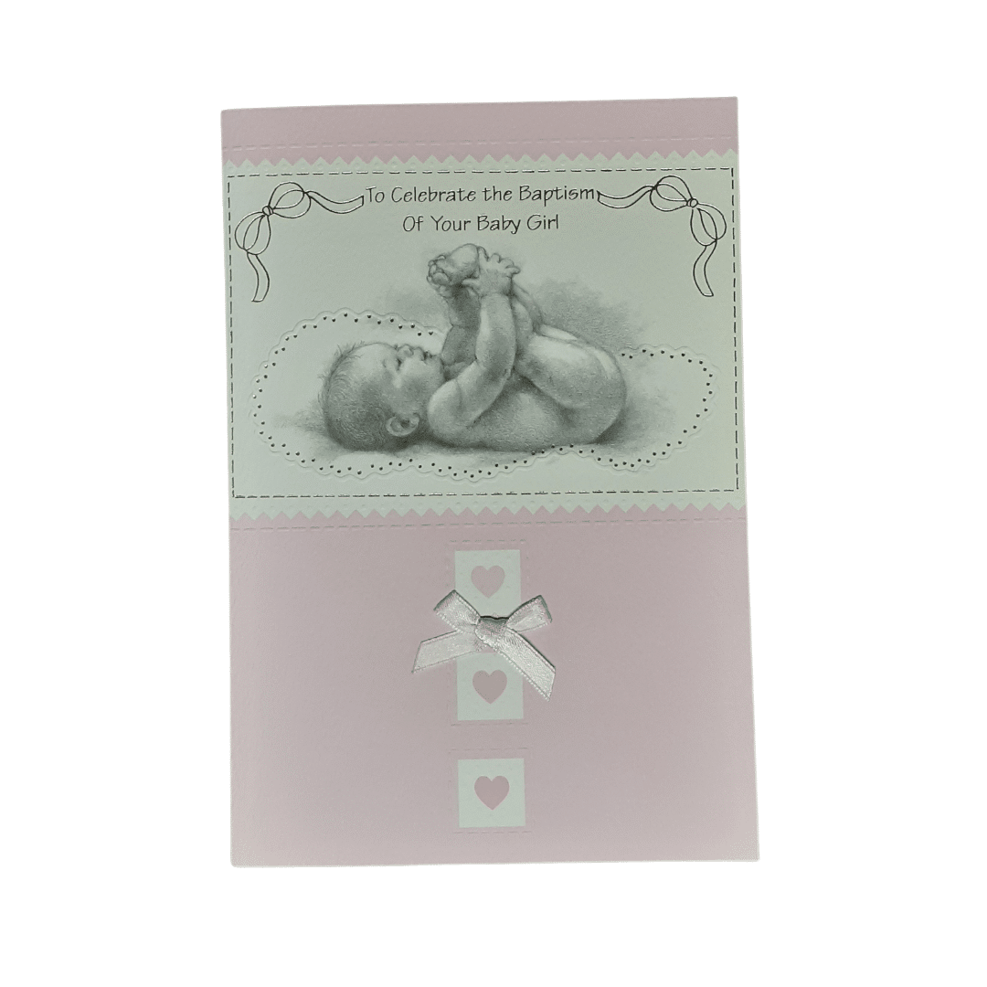 The Celebrate Baptism Card – Girl is a beautifully crafted piece, designed to commemorate the sacred occasion of a baby girl’s baptism. This elegant card features intricate pink details and a charming fabric bow, adding a touch of sophistication and sweetness to its design. It captures the essence of this special milestone with thoughtful details and a graceful appearance.