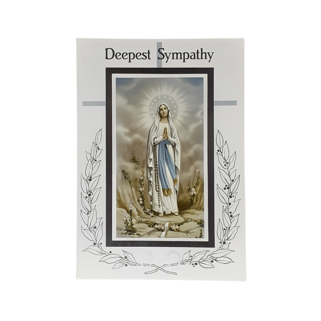 - front of the card has an image of Our Lady of Lourdes and the words “Deepest Sympathy”