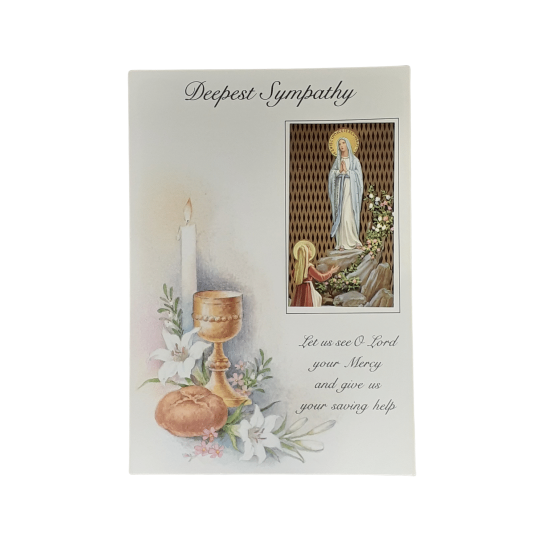 - lovely card to express your deepest sympathy to someone at theĀ deathĀ of a loved oneĀ front of the card has an image of St Bernadette and Mary of Lourdes andĀ the words “Deepest Sympathy” and “Let us see O Lord your Mercy and give us your saving help”