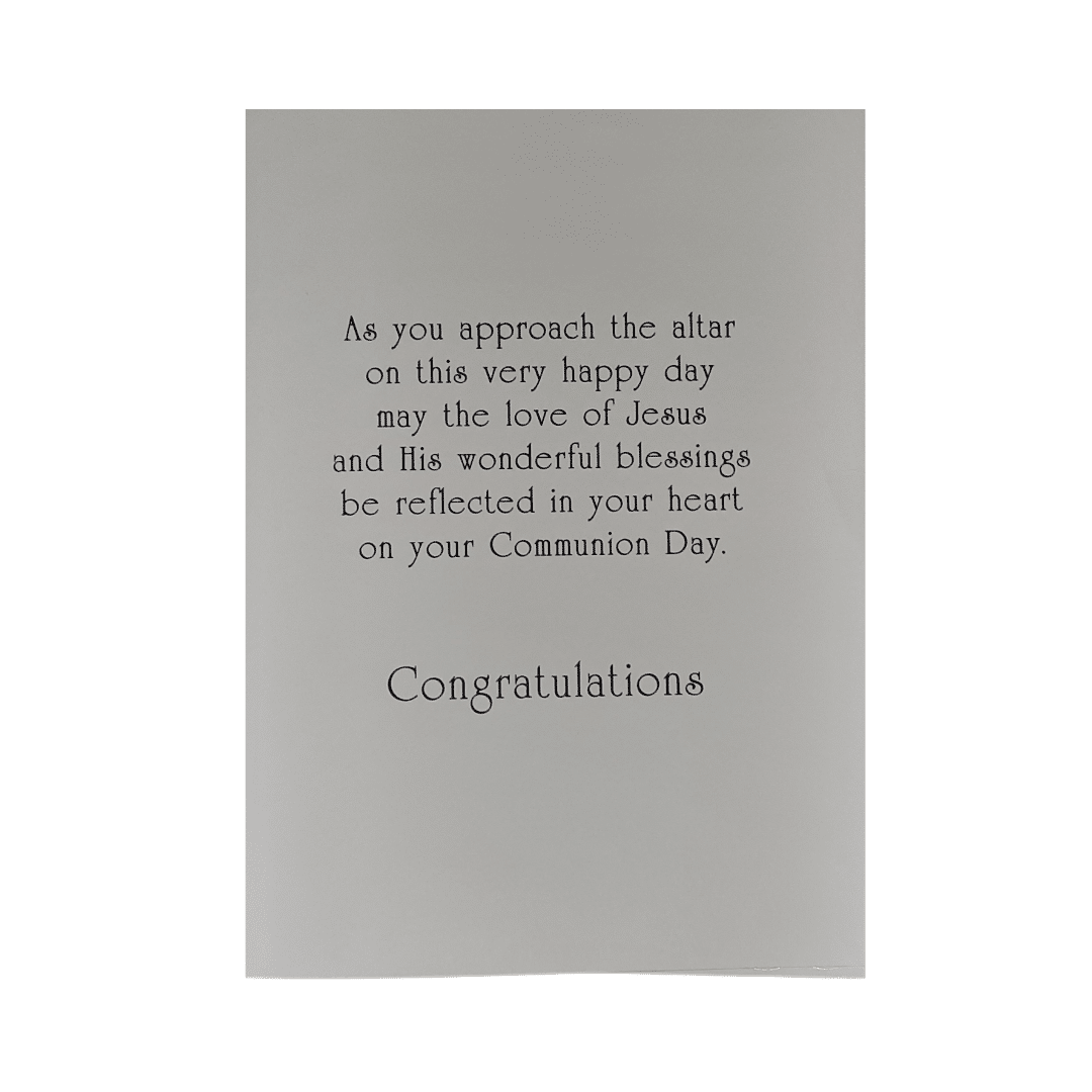 - Wording on the inside of the card“As you approach the altar on this very happy day may the love of Jesus and His wonderful blessings be reflected in your heart on your Communion Day. Congratulations.