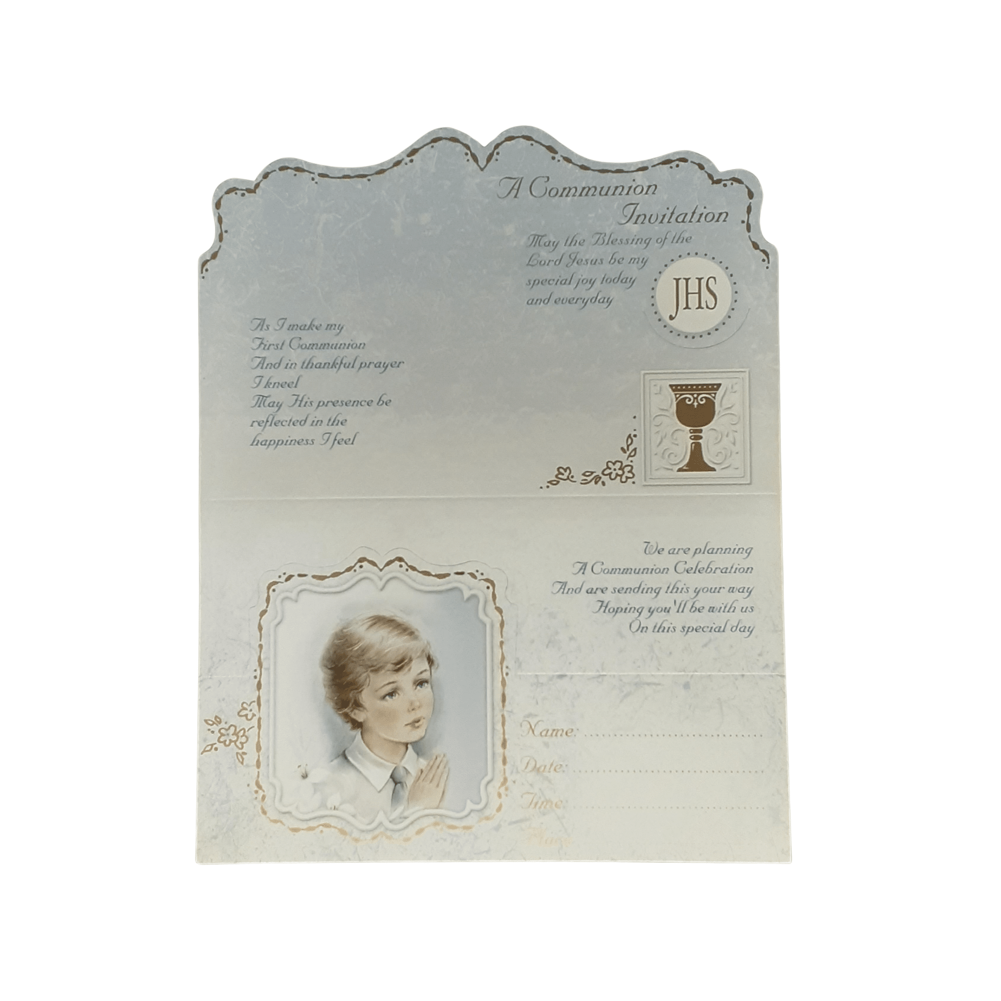 This invitation is a wonderful way to gather everyone together to support and celebrate with the young boy on his First Holy Communion.