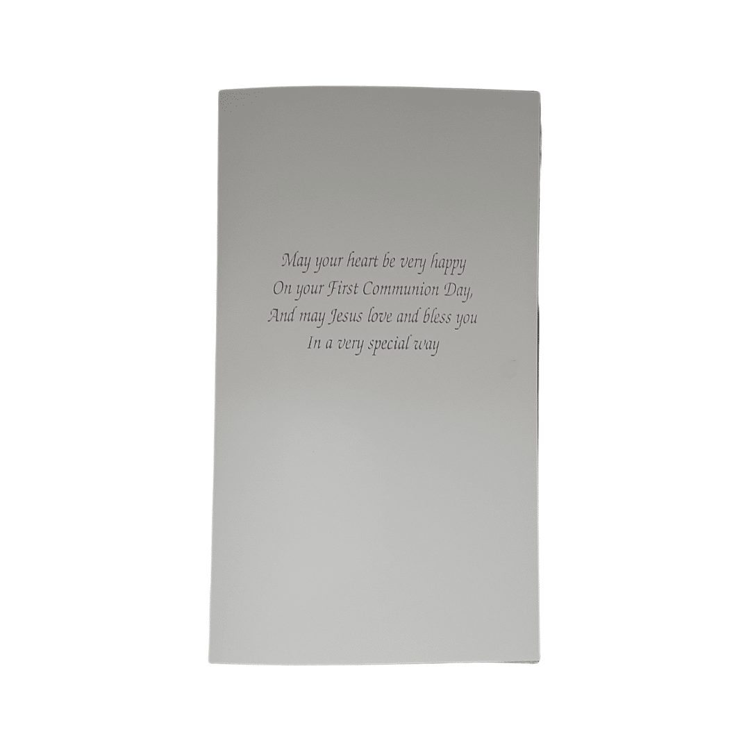 - Wording on the inside:Â May your heart be very happy on your first communion day and may Jesus love and bless you in a very special way”
