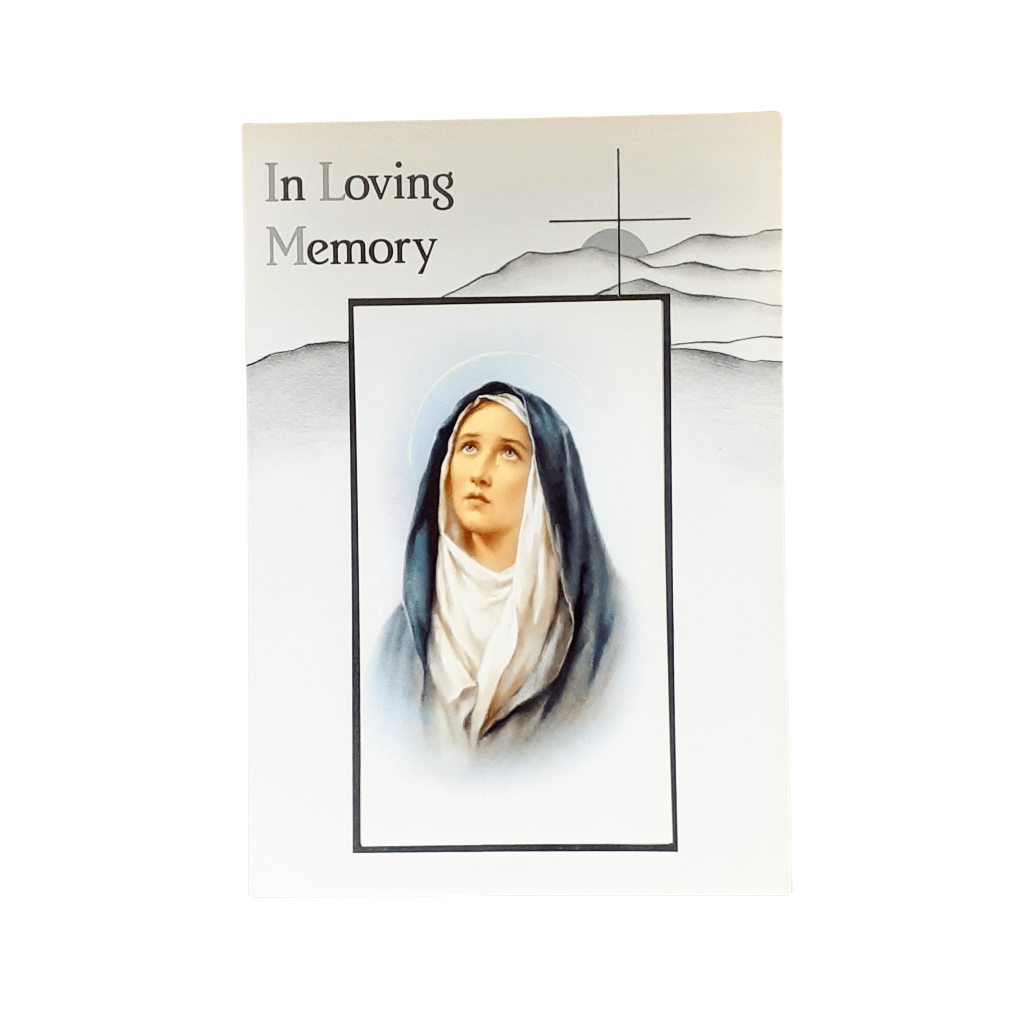 - inside has four pages, the first has a cross and place to write the giver’s name, the second is where the name of the deceased is placed, the third page has an image ofย praying hands,ย and the last has a crucifix