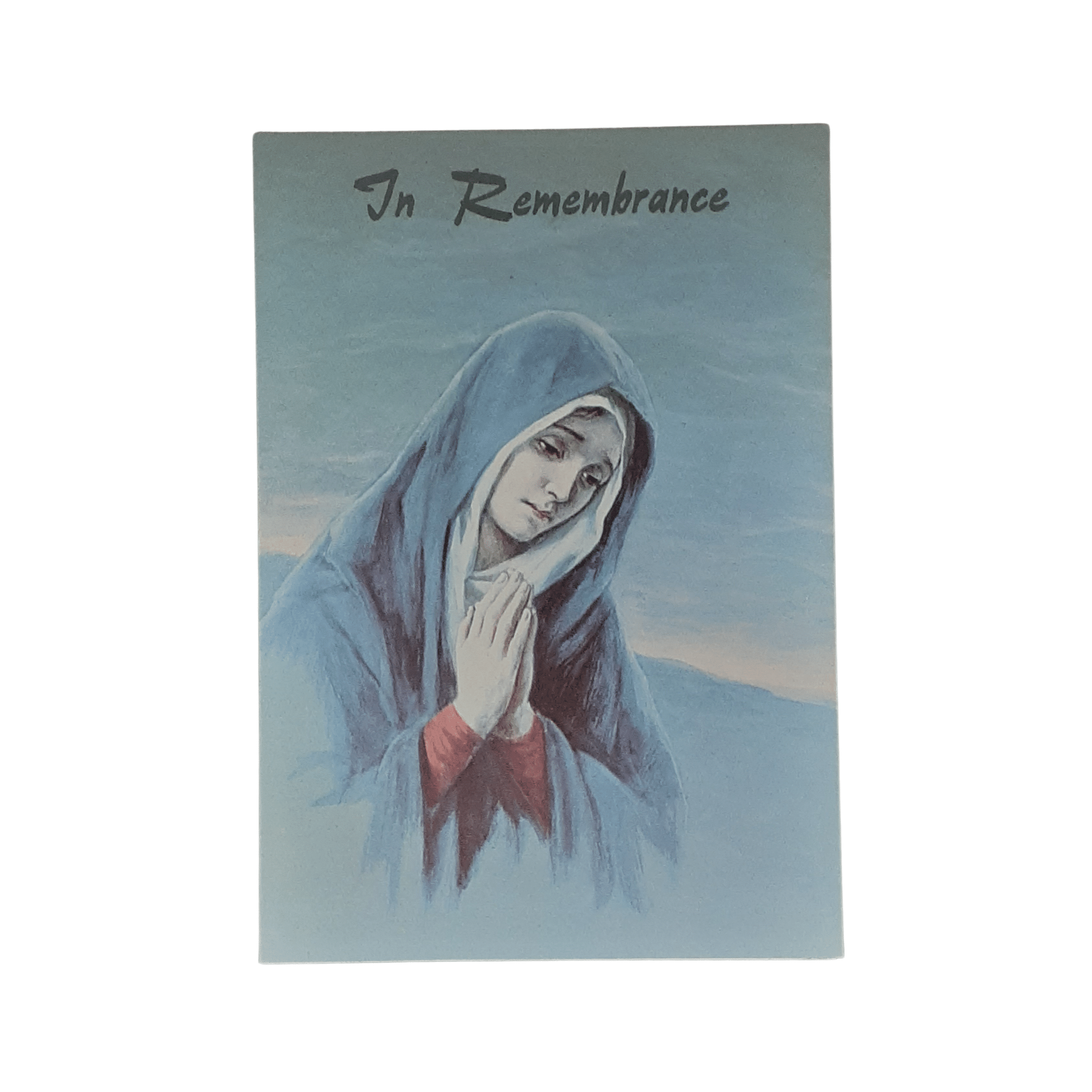 In Remembrance Mass Intention Card Sorrowful Mary simply designed With Deepest Sympathy Card, on a non gloss paper front has an image of Mary as sorrowful mother inside place to write the name of the deceased for whom the most Holy Sacrifice of the Mass is offered comes with an envelope measures approximately 15cm by 10cm it is a wholesome thing to pray for the deceased