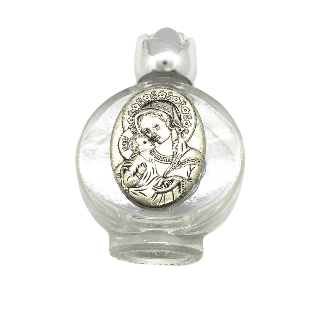 This bottle made of glass with a matching colour plastic lid and with a metallic like oval detail depicting the image of Mary and Jesus. to own.