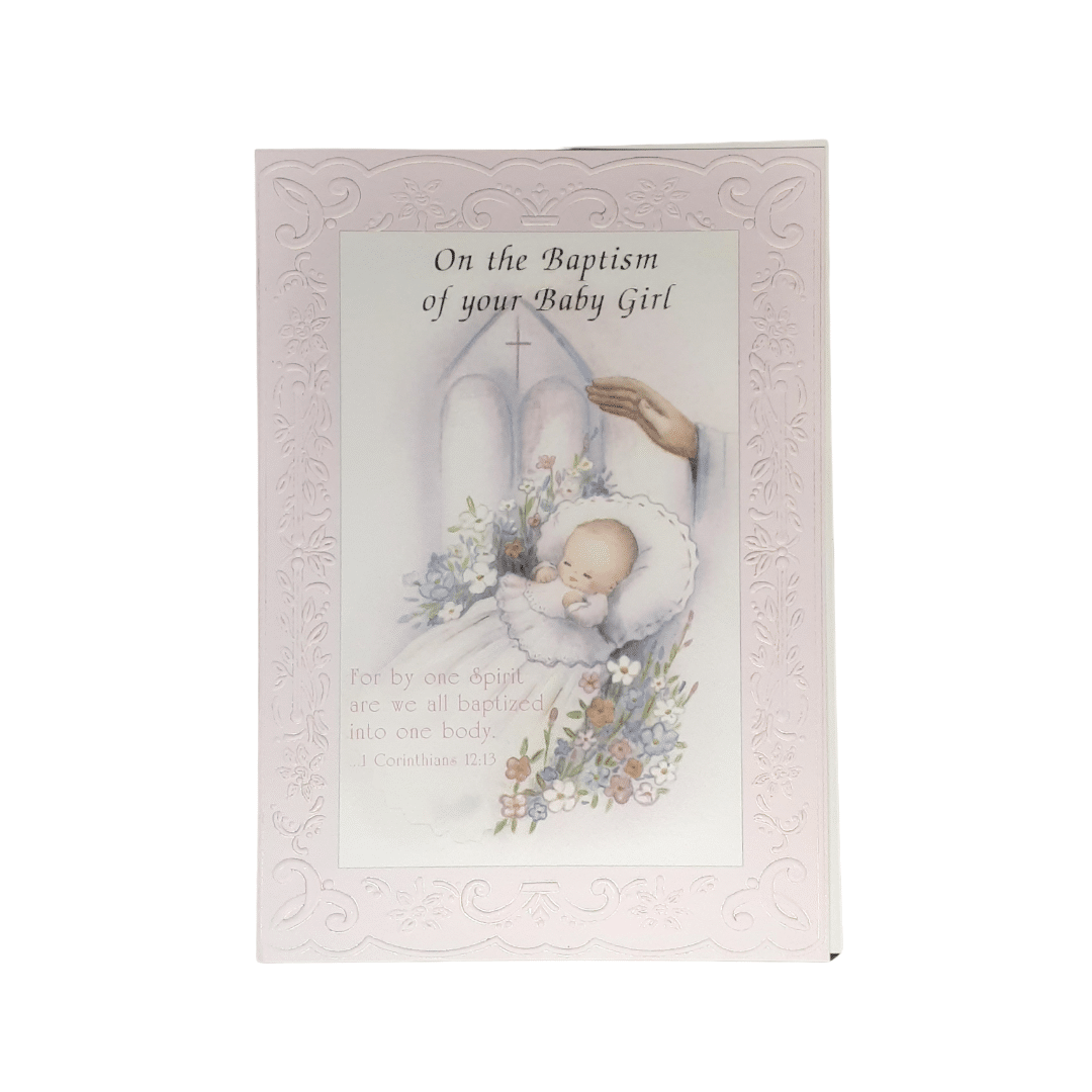 The Ornate Baptism Card – Girl is a beautifully designed piece, perfect for celebrating the sacred occasion of a baby girl’s baptism. This very pretty card features intricate pink lace-like details and a charming image of a baby on the front, adding a touch of elegance and sweetness to its design. The delicate embellishments and soft colors make this card an ideal choice for expressing your heartfelt congratulations.