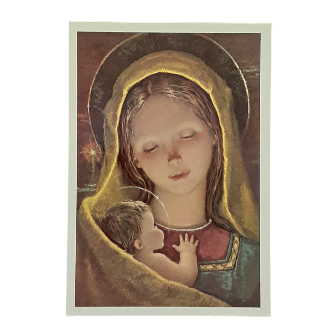 This Postcard Christmas Card is a charming greeting card made of high-quality cardboard. Measuring approximately 14.5 cm by 11 cm, it features a beautiful image of a mother and child in a vintage Italian representation on the front, evoking a nostalgic and timeless Christmas spirit. The reverse side is blank like a postcard, providing ample space for writing a personalized message or using it as a gift tag.
