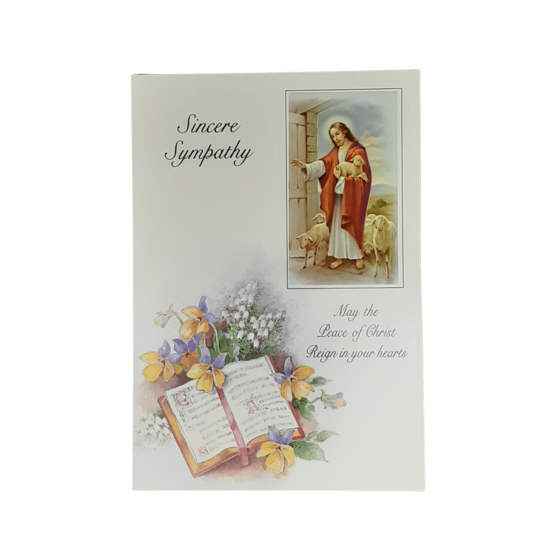 This beautiful Sincere Sympathy Card – Jesus and Lambs is a heartfelt way to express your sincere condolences during a time of loss. The front of the card features a serene image of Jesus with lambs, along with the words “Sincere Sympathy” and “May the peace of Christ reign in your hearts.” The card’s design is framed with a colorful border, adding a touch of peace and comfort.