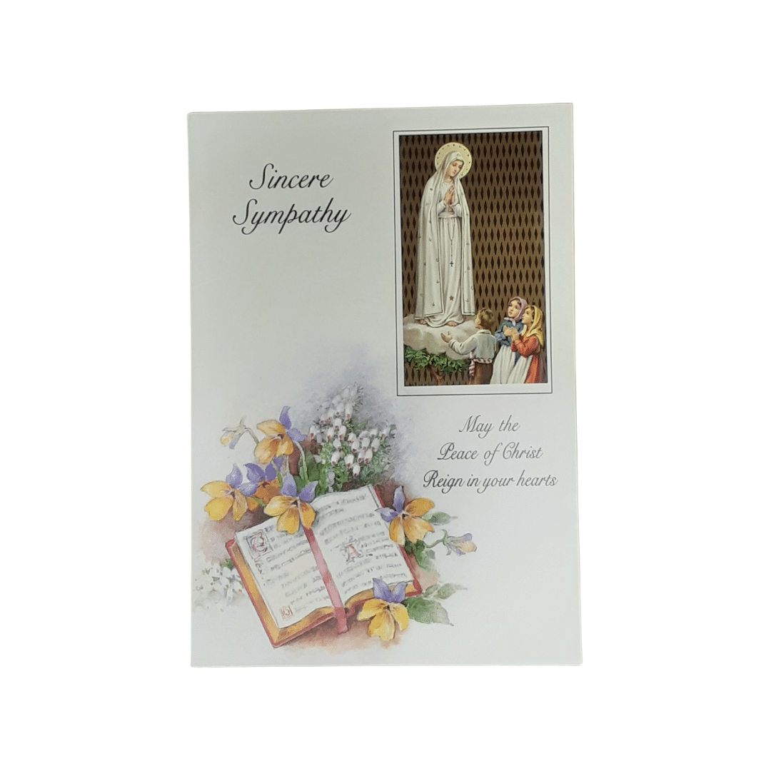 • front of the card has an image of Our Lady of Fatima andĀ  the words “Sincere Sympathy” and “May the peace of Christ reign in your hearts”