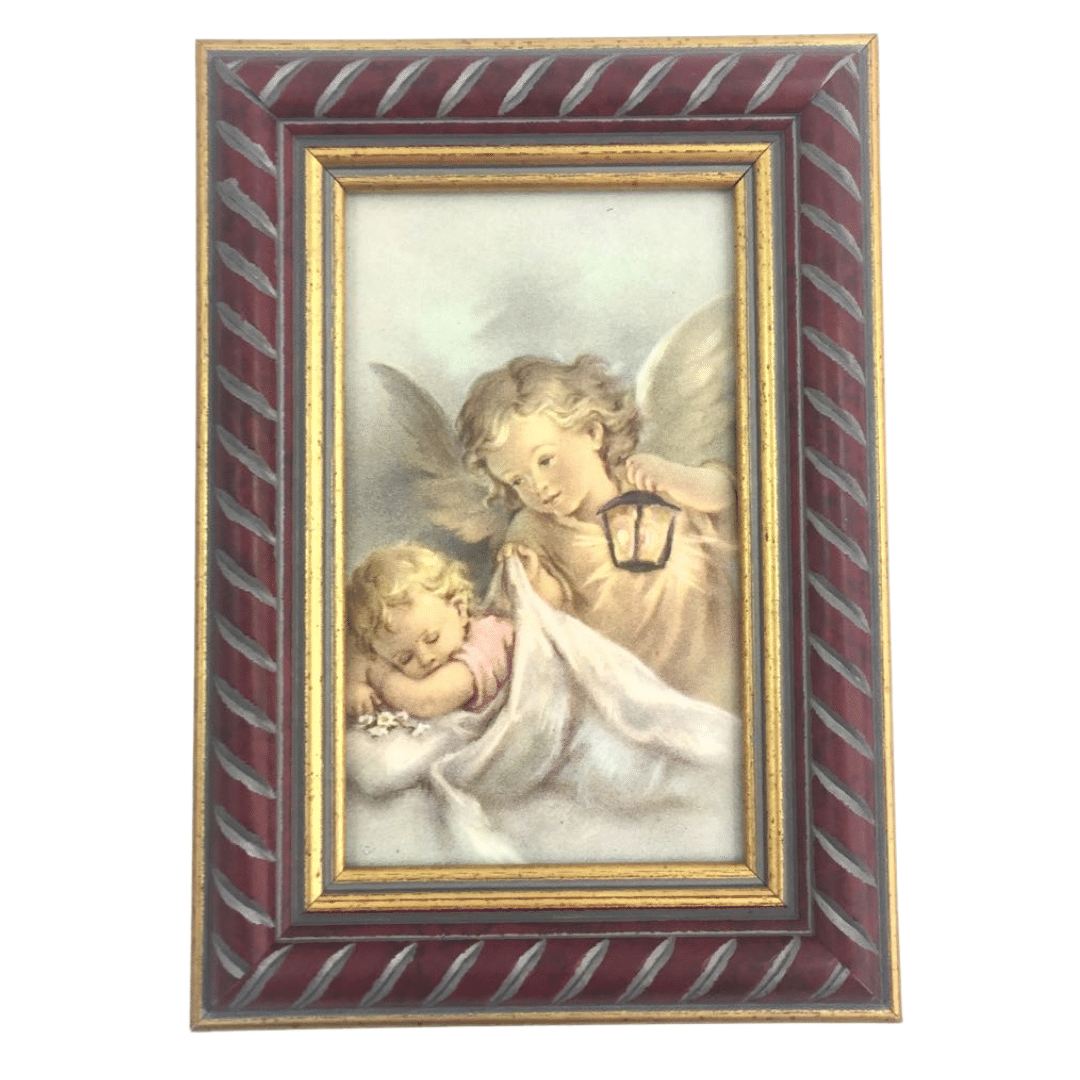 This Guardian Angel with Sleeping Baby Picture is professionally framed. it measures approcximately10cm by 14cm.The frame is a burgundy and gold colour.